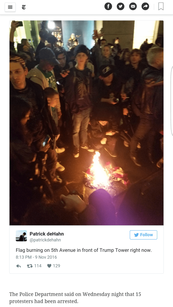 I was there when an American flag was burned outside Trump Tower after the 2016 US election, and my photo was featured in New York Times coverage online.